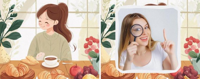 Οι εικόνες δείχνουν ένα χαριτωμένο κορίτσι να απολαμβάνει το πρωινό του στην κουζίνα του. Πίνει καφέ (ή τσάι) με νόστιμα κρουασάν. Και για επιδόρπιο, αναμένεται να έχει φρουτάκια. Οι εικόνες φαίνονται σχεδόν πανομοιότυπες, με τέσσερις λεπτές διαφορές μεταξύ τους. Θα μπορέσετε να τις βρείτε;