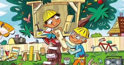 Η εικόνα δείχνει έναν παππού και τον εγγονό του να φτιάχνουν μια καλύβα σε ένα δέντρο. Διακρίνονται επίσης ένα μαγνητόφωνο, ένα ποδήλατο, ένα τραπέζι, σπίτια, ακόμα και γράμματα. Πρέπει να βρούμε τον μαγνήτη.