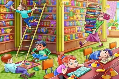 Στην εικόνα βλέπουμε μια βιβλιοθήκη όπου κάποια παιδιά διαβάζουν βιβλία και κάποια παίζουν επιτραπέζια παιχνίδια. Ο βιβλιοθηκάριος μεταφέρει έναν μεγάλο αριθμό βιβλίων για να τα τοποθετήσει στα ράφια.