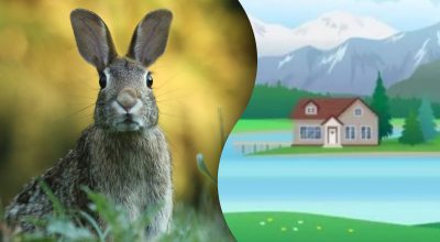 Στην εικόνα βλέπουμε ένα σπίτι δίπλα στη λίμνη και λίγο πιο πίσω από το σπίτι – τα βουνά. Βλέπουμε επίσης τον ουρανό και τα σύννεφα, έναν μικρό αριθμό δέντρων και γρασίδι. Αλλά κάπου ανάμεσα σε αυτή τη φύση υπάρχει ένα κρυμμένο ζώο – ένα κουνέλι, το οποίο θα είναι πολύ δύσκολο να εντοπιστεί.