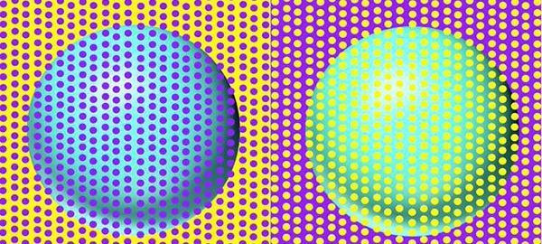 Οι μπάλες φαίνονται διαφορετικές επειδή η αριστερή μπάλα περιβάλλεται από μοβ κουκκίδες σε κίτρινο φόντο και η δεξιά μπάλα περιβάλλεται από κίτρινες κουκκίδες σε μοβ φόντο.