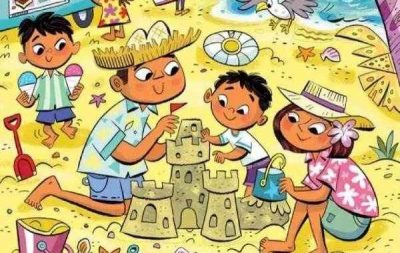 Στην εικόνα βλέπουμε μια ενδιαφέρουσα πλοκή – ο μπαμπάς, η μαμά και τα παιδιά τους ξεκουράζονται στην παραλία και χτίζουν ένα κάστρο από άμμο. Δύο παιδιά – ένα αγόρι και ένα κορίτσι – έτρεξαν για παγωτό.